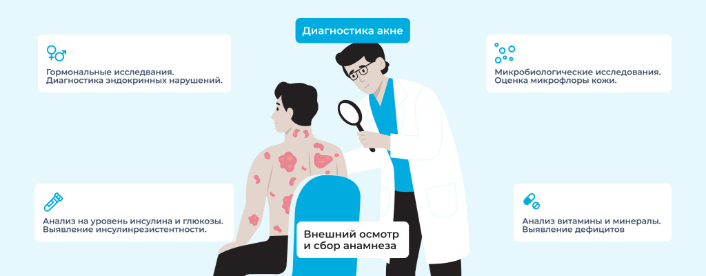 Хотя акне диагностируется на основании клинической картины, иногда для выявления возможных внутренних причин могут потребоваться лабораторные обследования. Они включают: