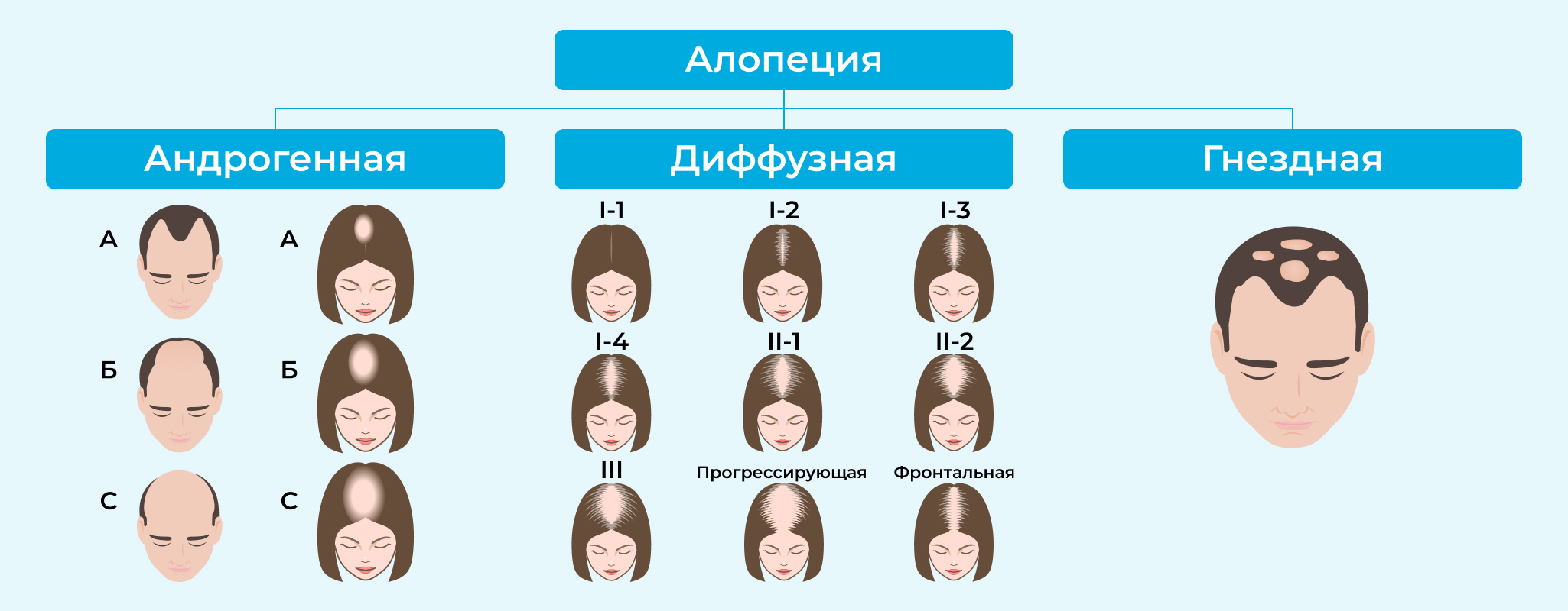 К группе нерубцовых алопеций относят андрогенетическую, диффузную, очаговую формы, а также облысение, вызванное различными заболеваниями, например, щитовидной железы, крови, при грибковых поражениях, вторичном сифилисе и других инфекциях.