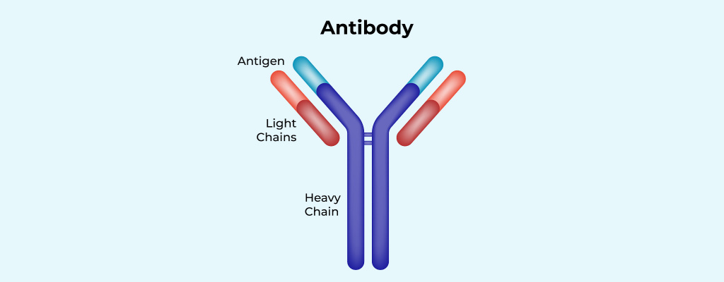 По форме молекула антитела напоминает латинскую букву «Y» или рака с клешнями. Она состоит из двух легких и двух тяжелых цепей, соединенных между собой. В каждой цепи можно выделить константные и вариабельные части. Константные одинаковые у всех молекул, а вариабельные различаются – они обеспечивают связывание с антигеном, и за счет них достигается специфичность.