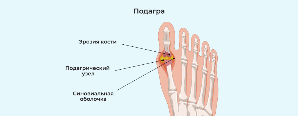 Подагра – это заболевание, обусловленное подъемом в крови показателя мочевой кислоты, соли которой откладываются в тканях. Часто происходит поражение плюснефалангового сустава большого пальца ноги, что проявляется сильной болезненностью. Если болезнь прогрессирует, то могут поражаться и другие суставы.