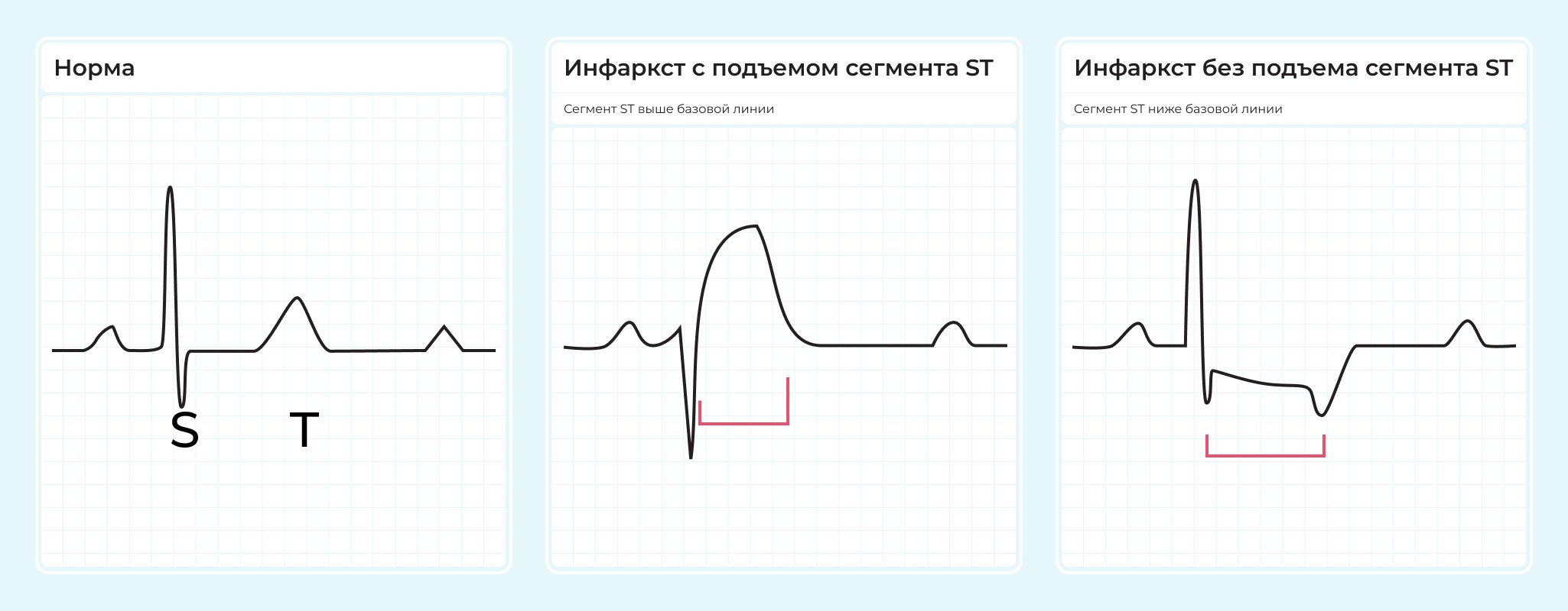 Рис. 2 Так выглядит электрокардиограмма в норме, при инфаркте миокарда с подъемом ST и без подъема. За характерный внешний вид врачи называют приподнятый сегмент ST «кошачьей спинкой».