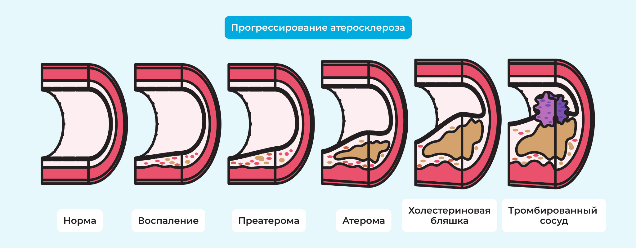 Рис.1 Стадии атеросклероза. На рисунке видно, что в финале на поврежденной бляшке формируется тромб.