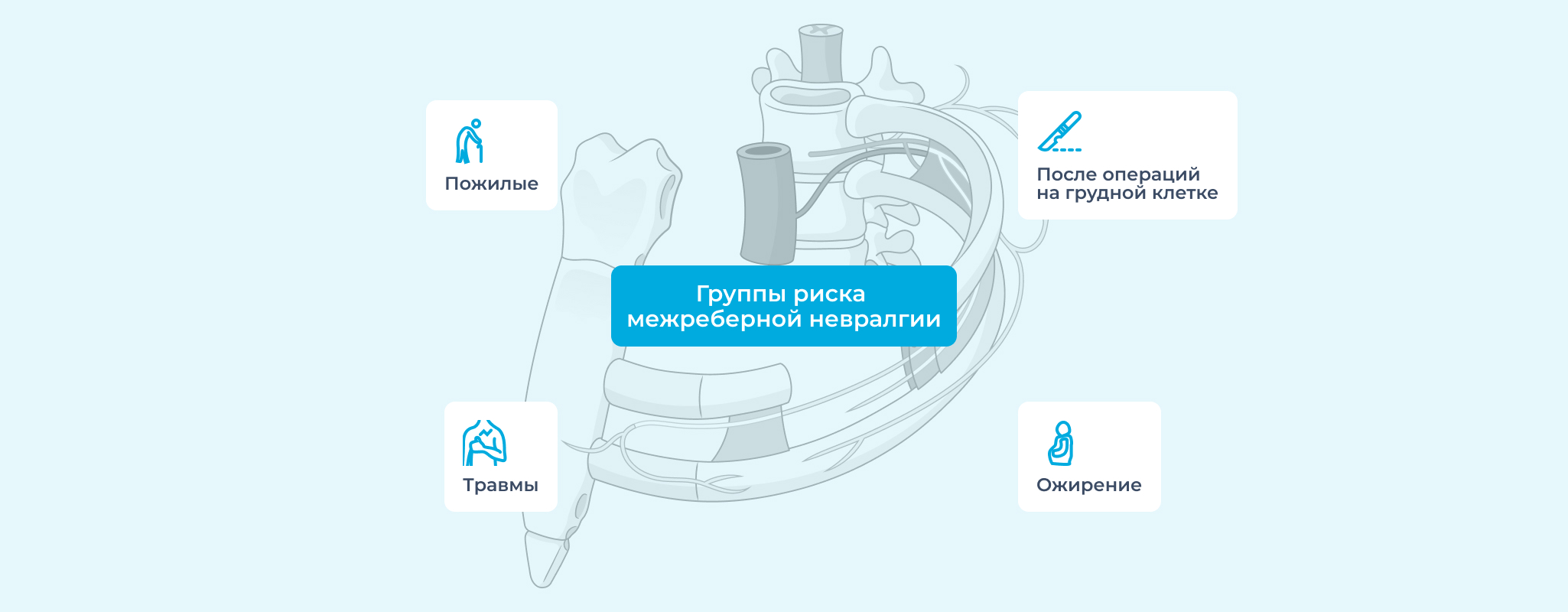 Любые механические повреждения грудной клетки или позвоночника — например, переломы рёбер, ушибы, спортивные травмы — могут привести к повреждению межрёберных нервов. Длительные или резкие нагрузки, сильные скручивания туловища и чрезмерное напряжение мышц создают предпосылки для развития воспаления и сдавления нервных волокон.