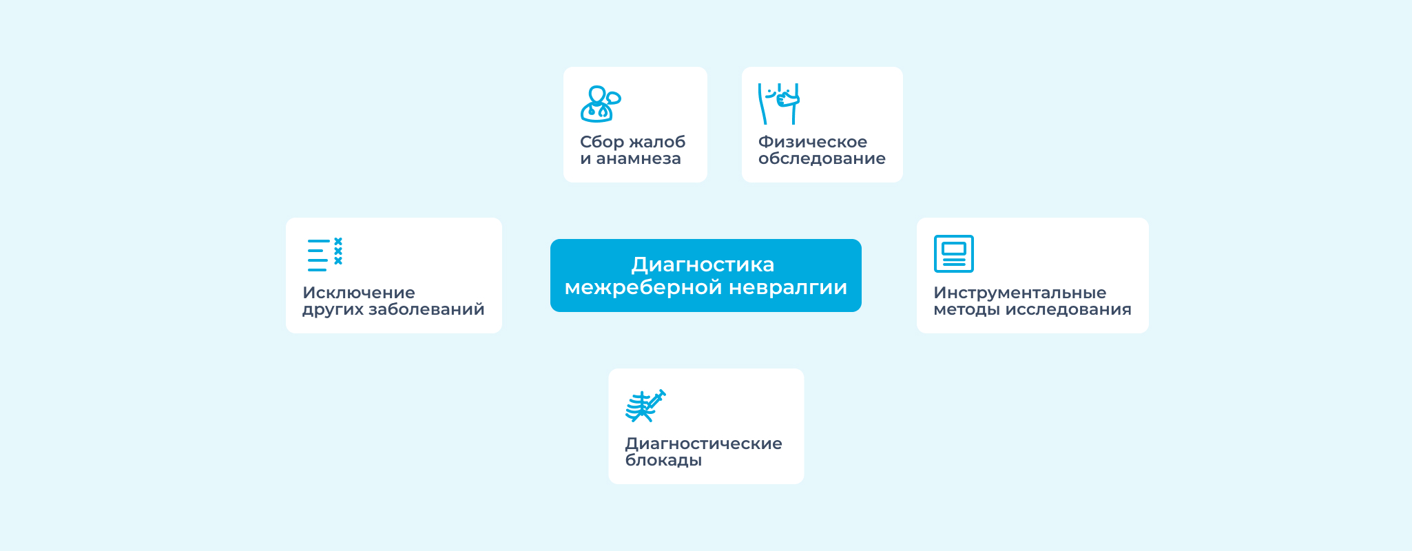 Межрёберная невралгия — это заболевание, при котором очень важно точно установить причину боли, чтобы назначить правильное лечение. Диагностика помогает отличить невралгию от других, порой более серьёзных заболеваний, которые тоже вызывают боль в грудной клетке, например, сердечных или лёгочных проблем. Важно исключить жизнеугрожающие состояния, особенно инфаркт, плеврит, пневмоторакс.