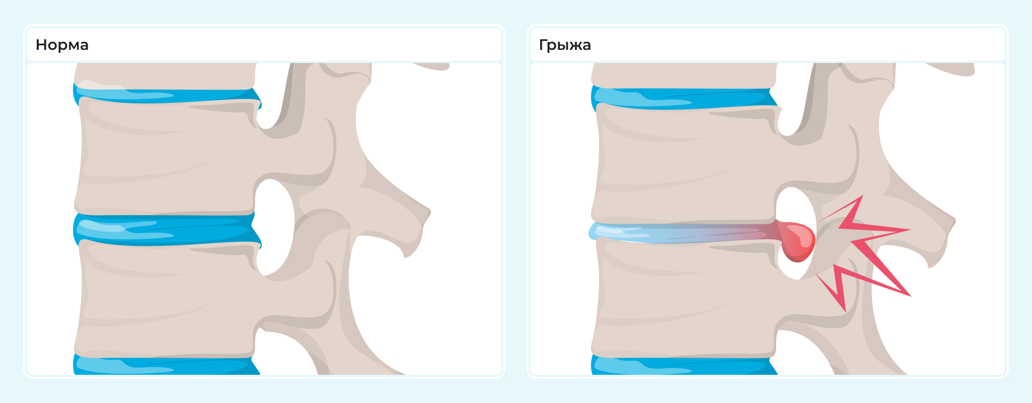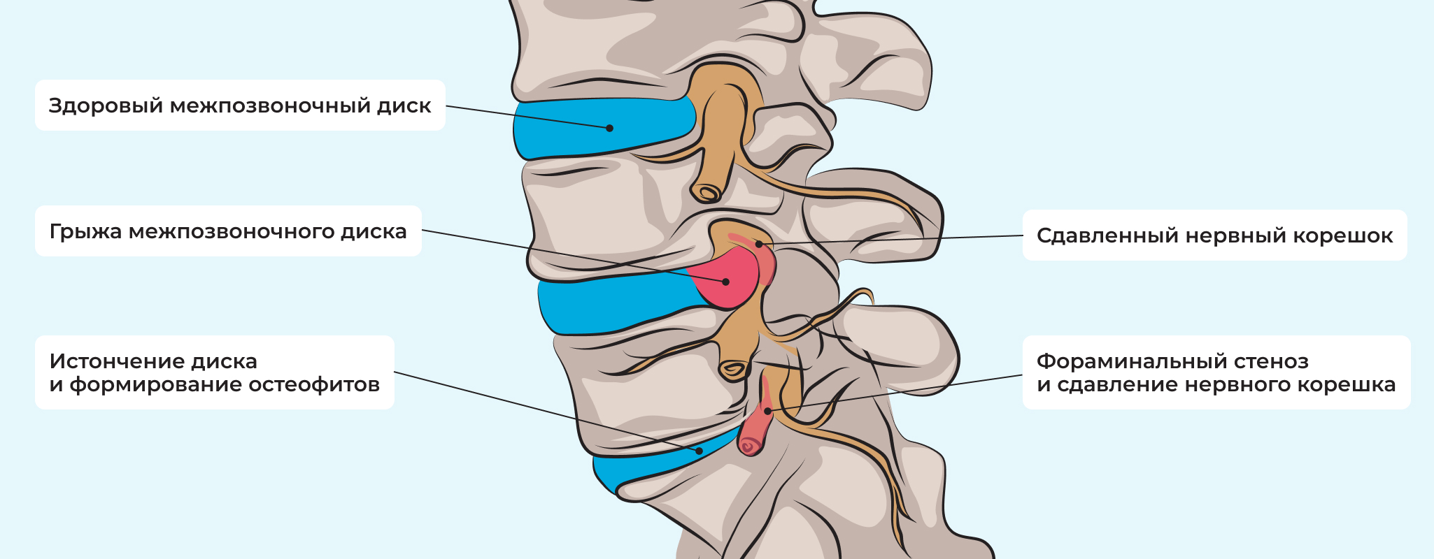 Если диск прорывает фиброзное кольцо, то кровеносные сосуды, нервы, спинной мозг сдавливаются, что приводит к нарушению нервной проводимости или кровоснабжения. При этом образуется отек, который приводит к еще большему сдавлению структур спинномозгового канала.