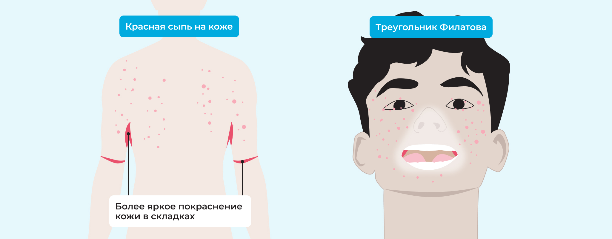 Слева: так выглядит при скарлатине сыпь. Справа: на этой картинке хорошо виден треугольник Филатова между носом и губами.