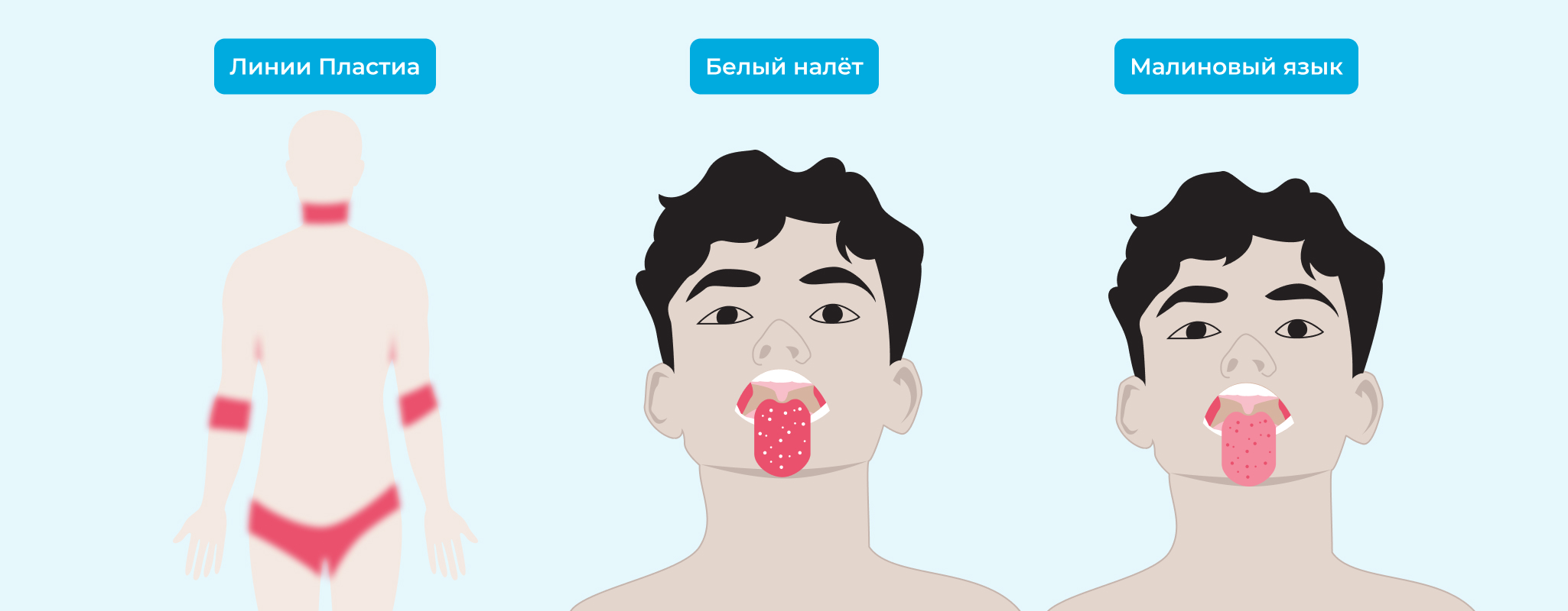 Слева направо: симптом Пастиа, язык, обложенный белым налетом, и «малиновый язык».